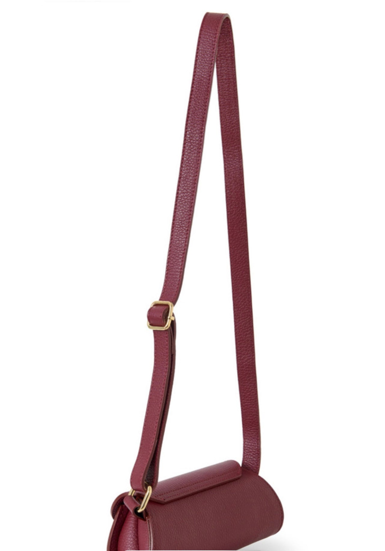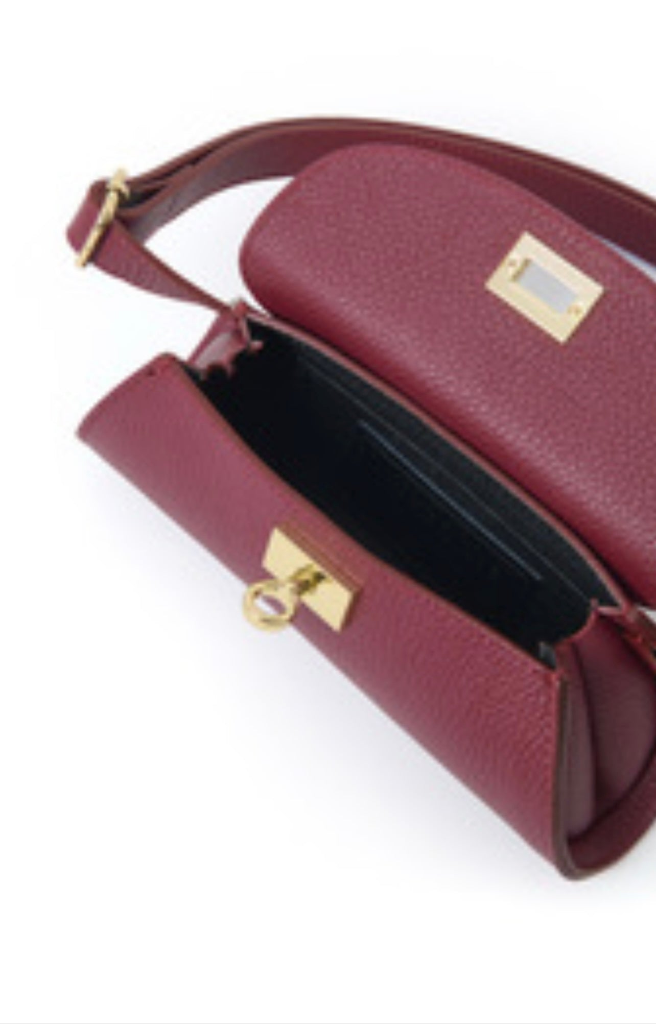 A very cute, burgundy premium leather shoulder bag /crossbody bag which is ideal for the evening. Small and beautifully made with gold clasp front opening. A perfect bag to take just your essentials out with you.