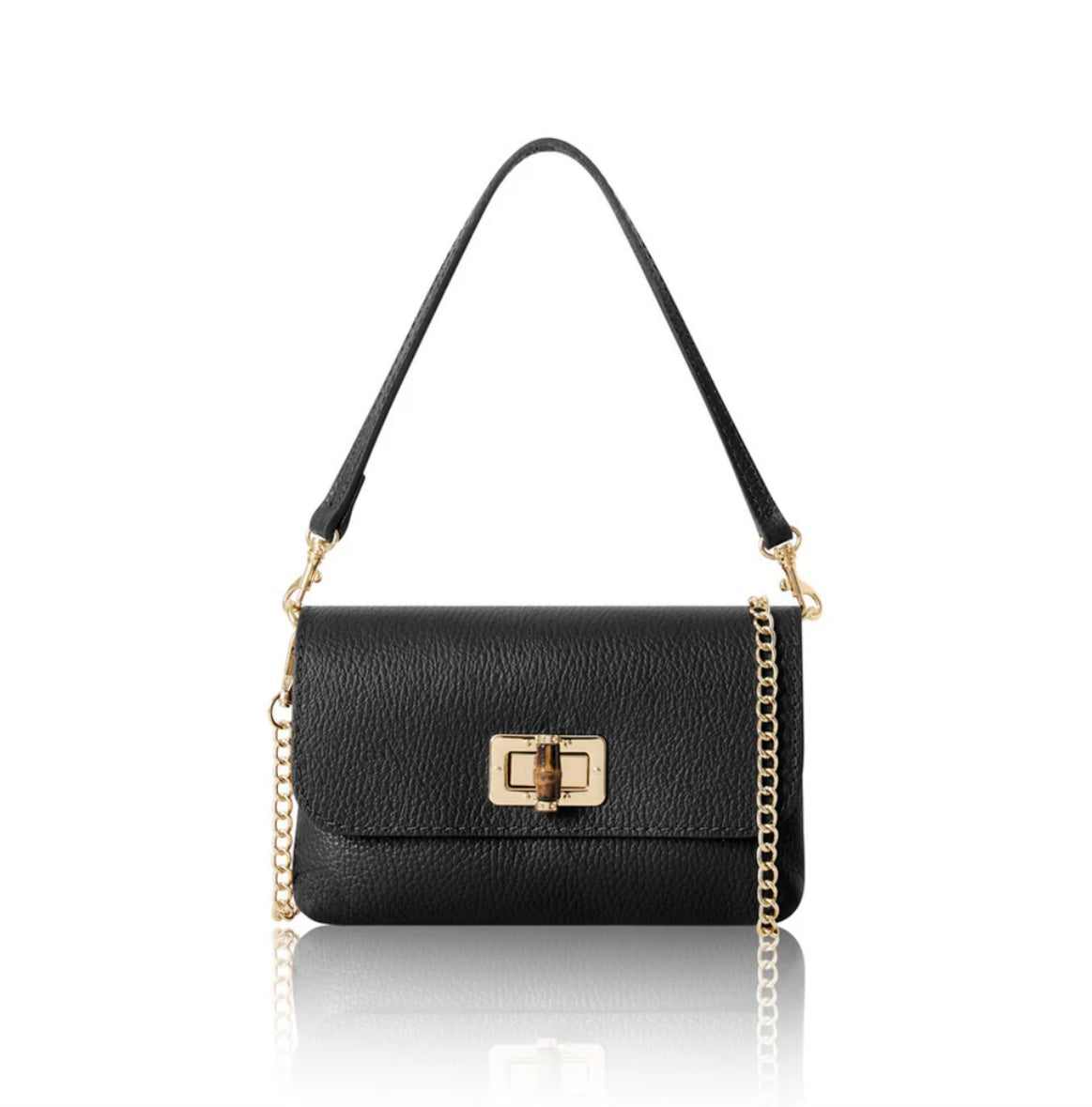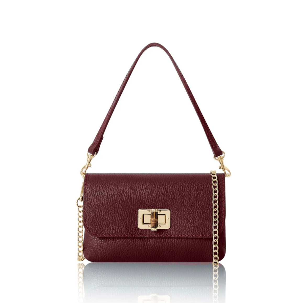 A three in one style in leather! Can be worn as a clutch, handheld and crossbody bag. Detachable gold chain and short leather hand held strap. Bamboo twist clasp for opening and closing. One large compartment inside. Gold hardware for detachable straps and clasp plate.